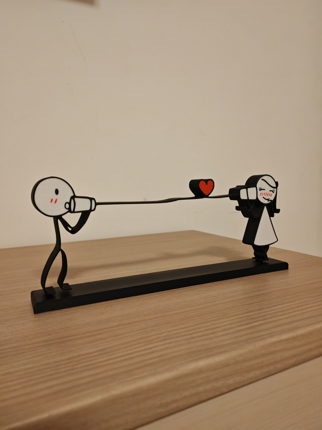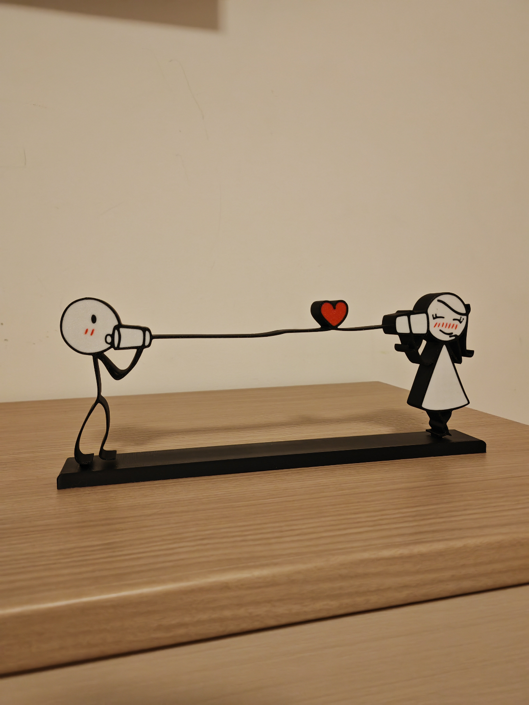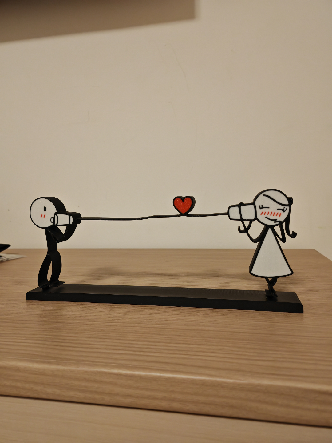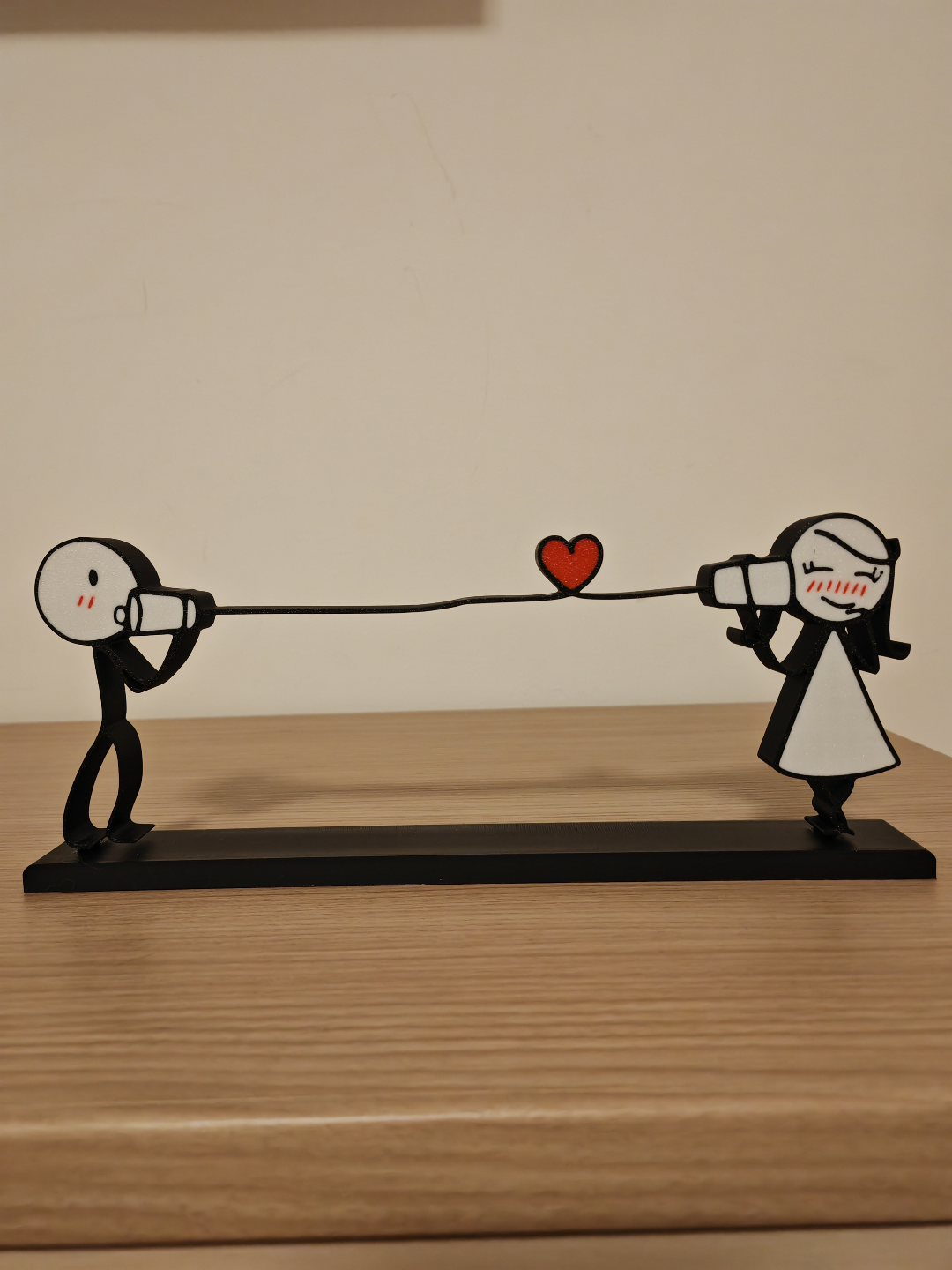 Žaisminga komunikacijos idėja: Personažai, laikantys „telefonus“ (puodelius), simbolizuoja tai, kad mylimieji visada randa būdą vienas kitą išgirsti ir suprasti.