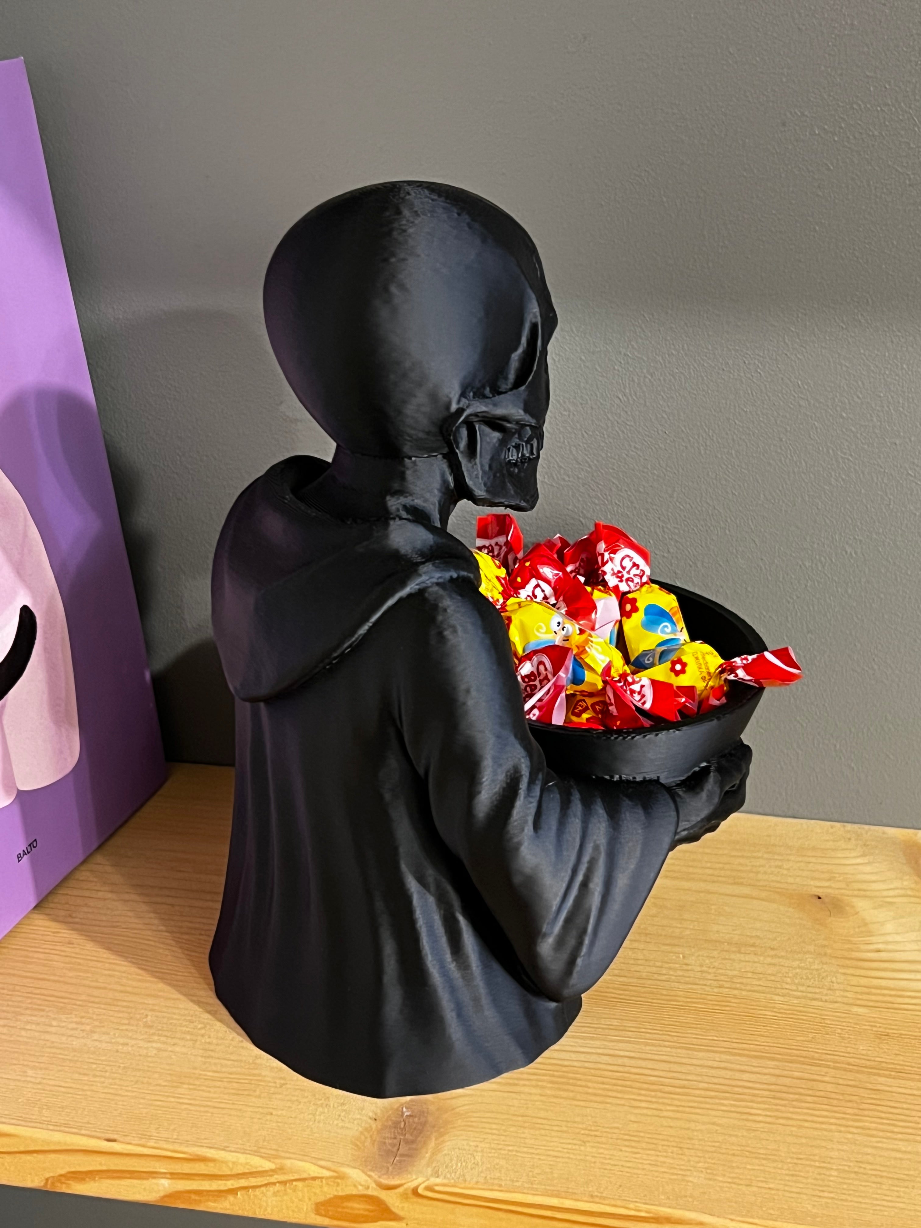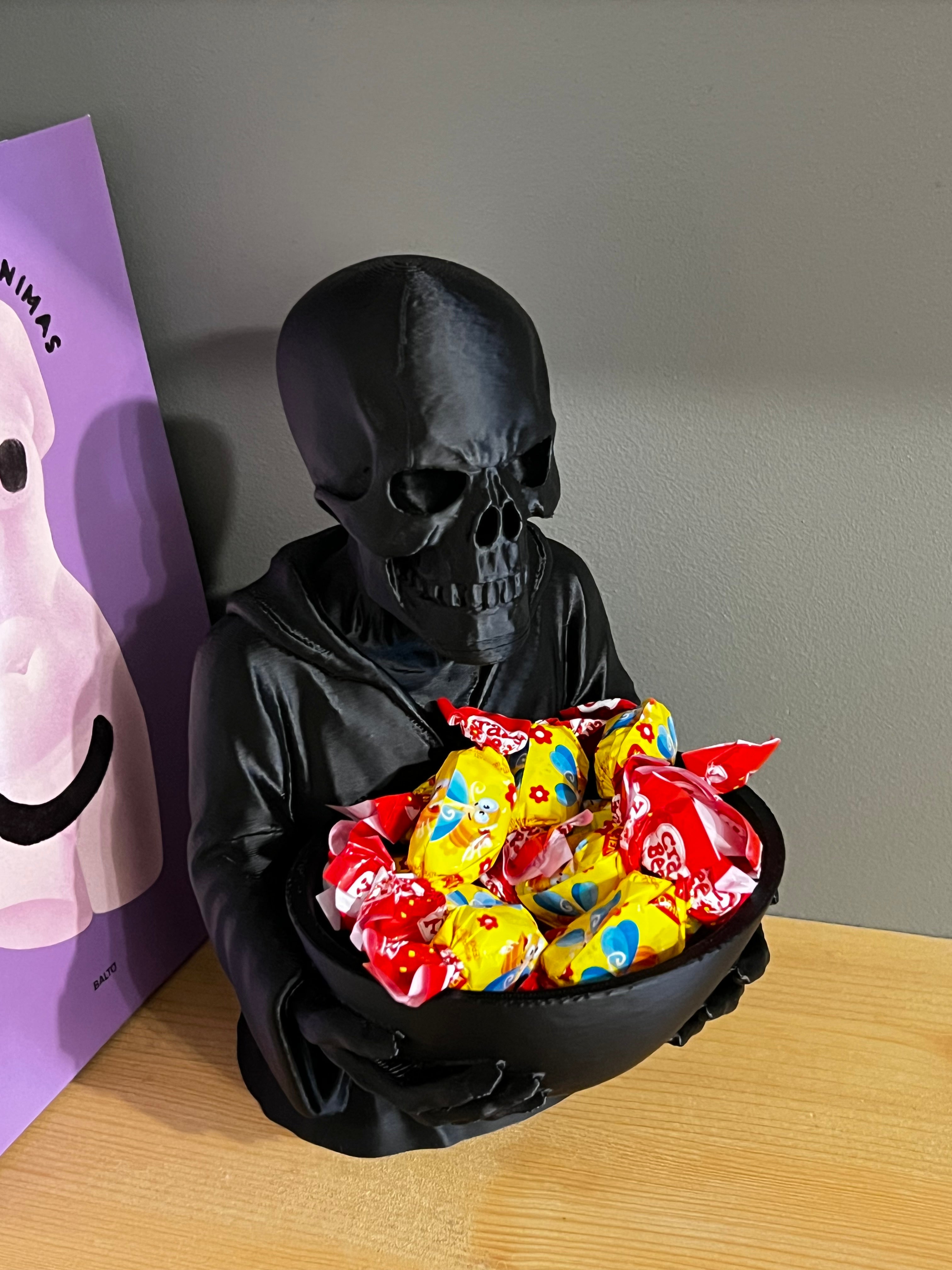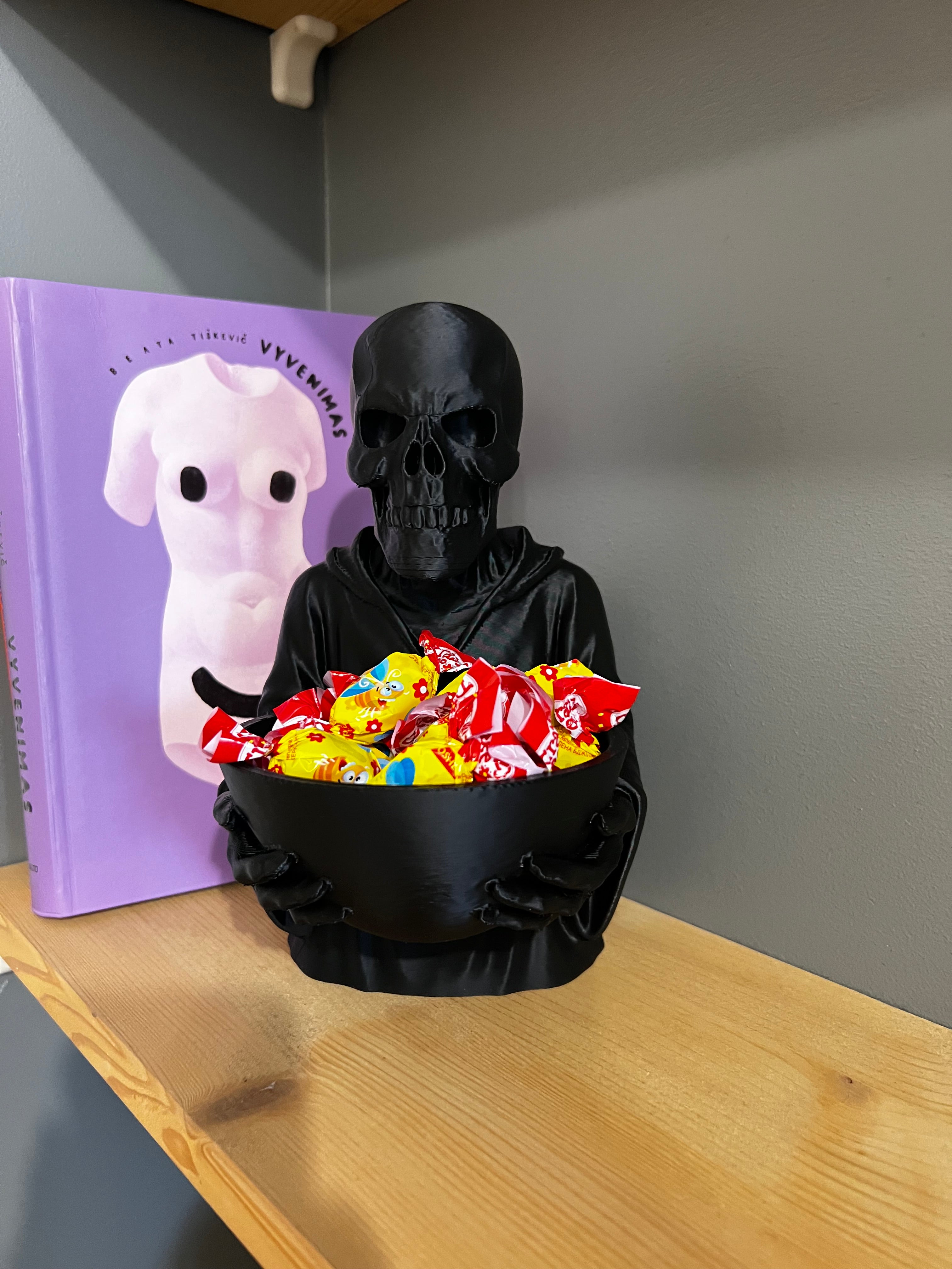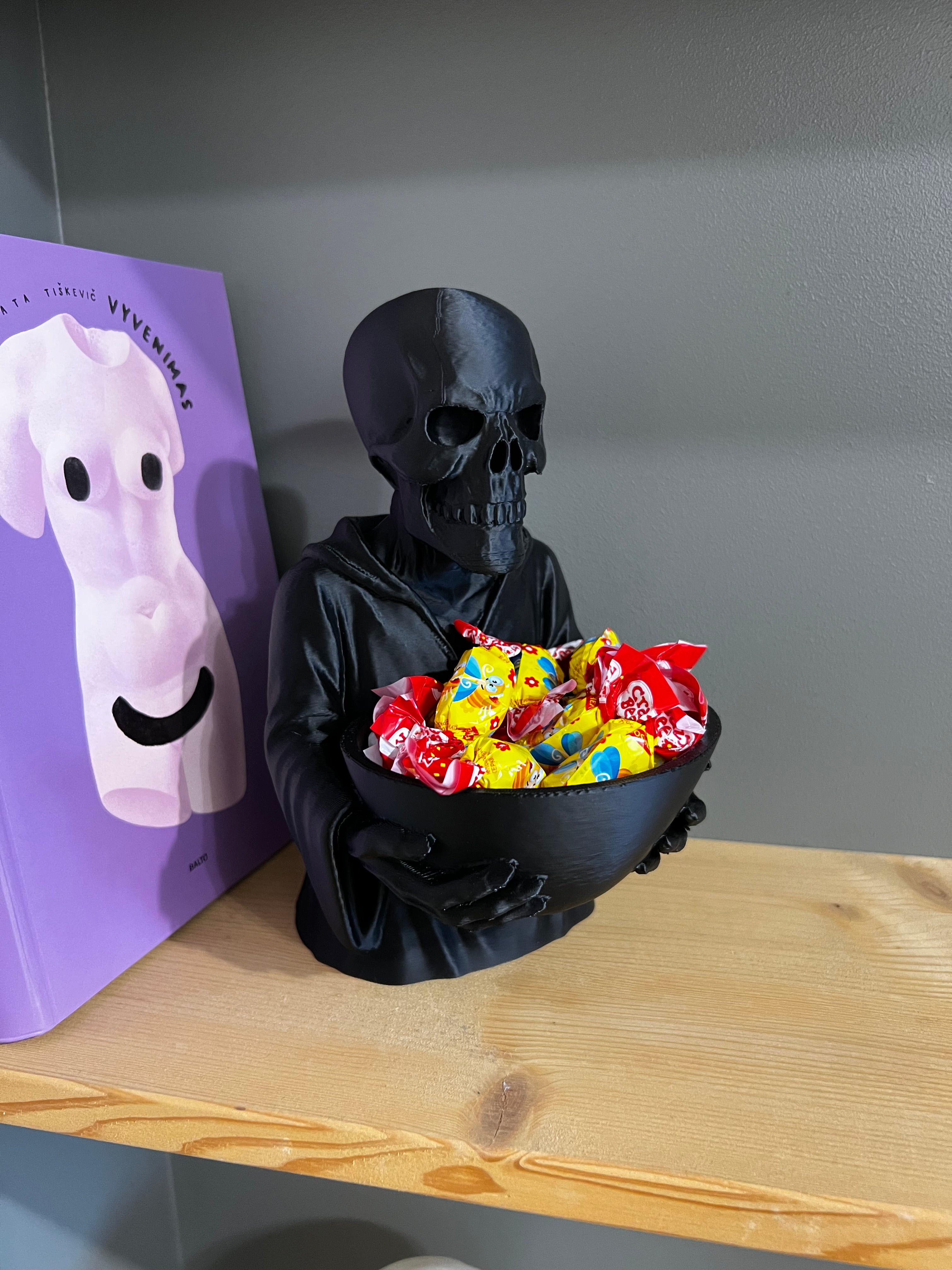 Išraiškinga ir funkcionali Helovyno dekoracija – skeletas, tvirtai laikantis talpų dubenį saldainiams ar užkandžiams. Minimalistiškai juoda spalva ir kruopščios detalės akimirksniu sukuria „spooky“ nuotaiką bet kurioje erdvėje – nuo namų prieškambario iki vakarėlių stalo ar parduotuvės vitrinos.