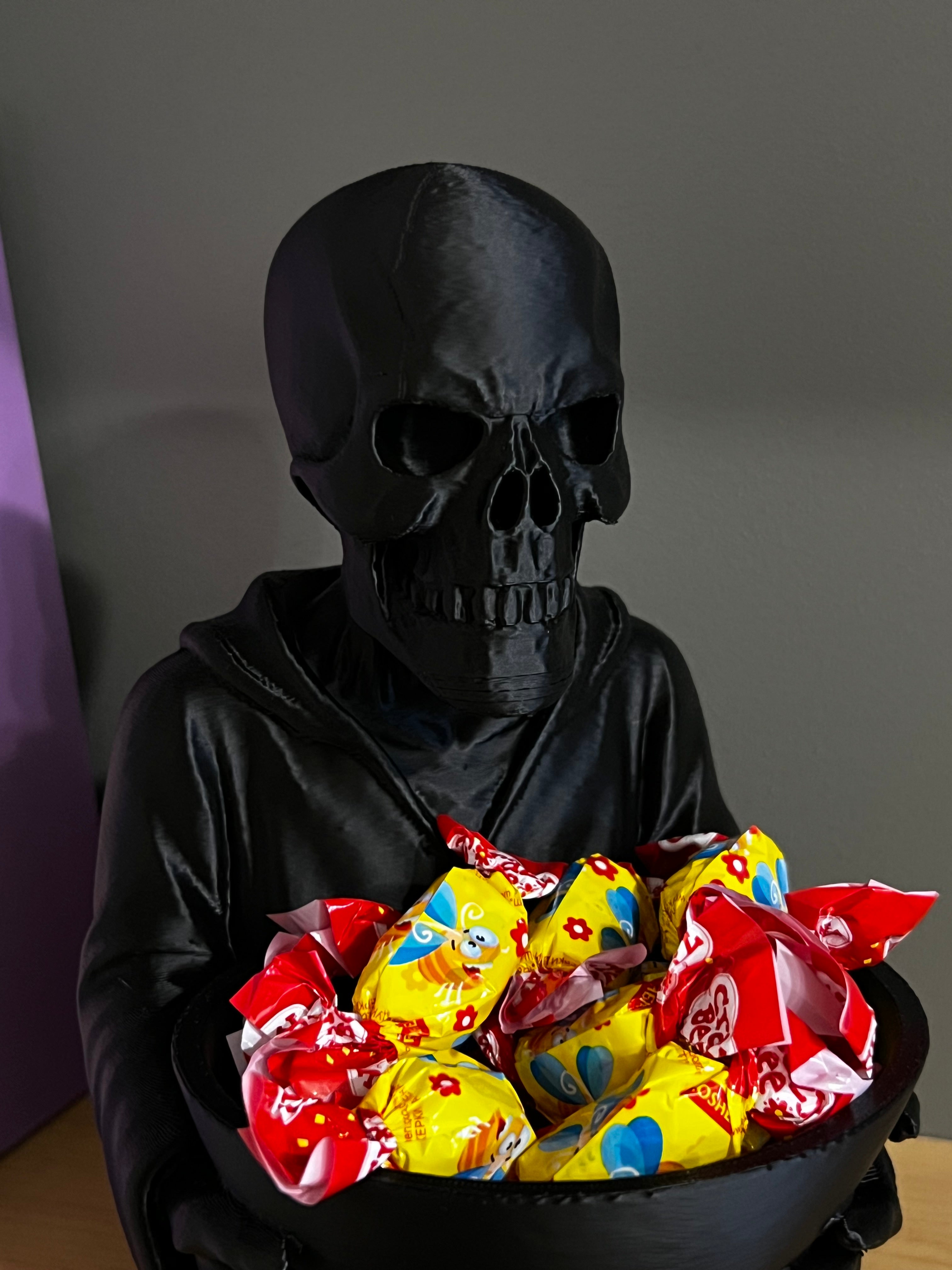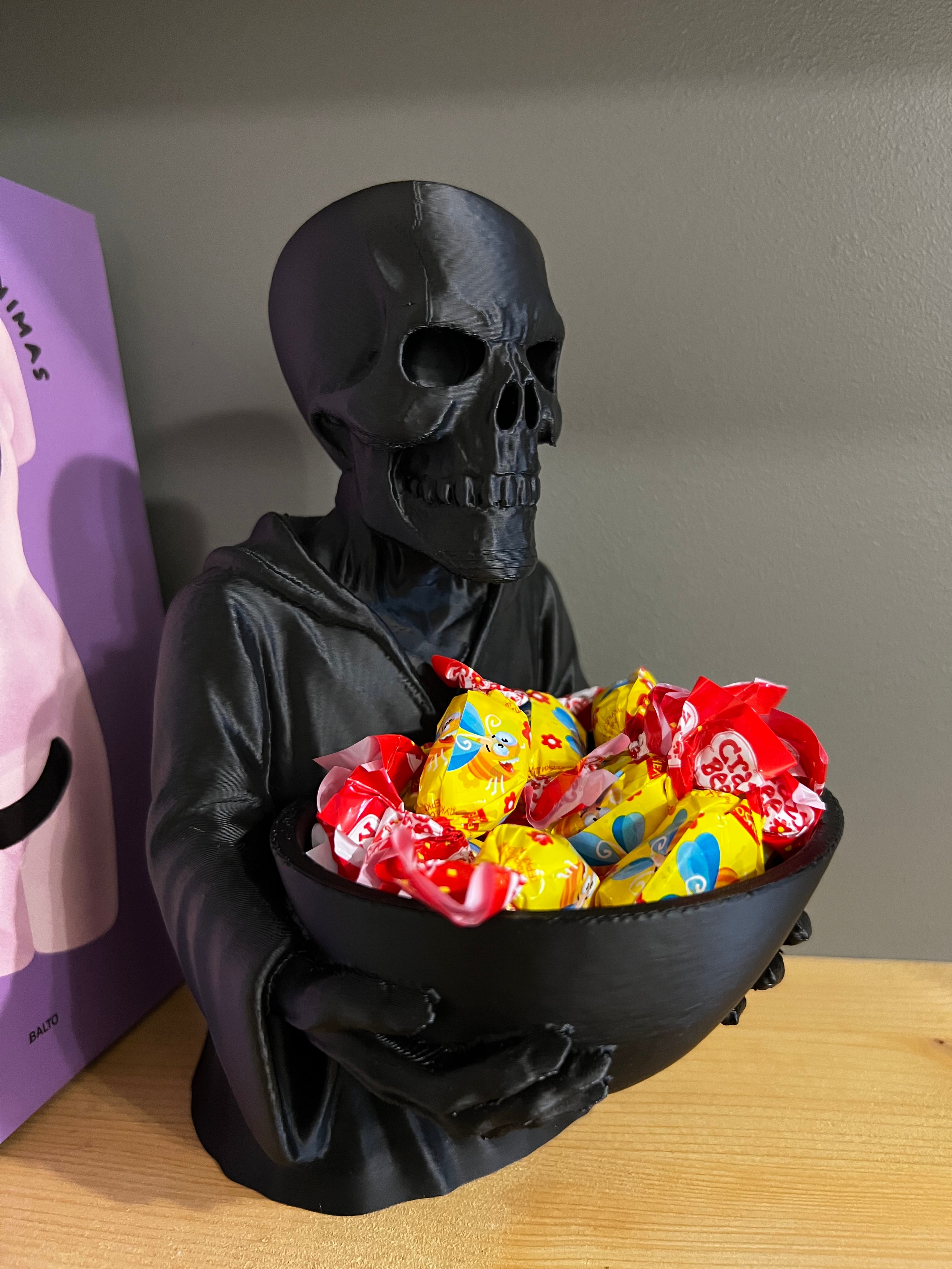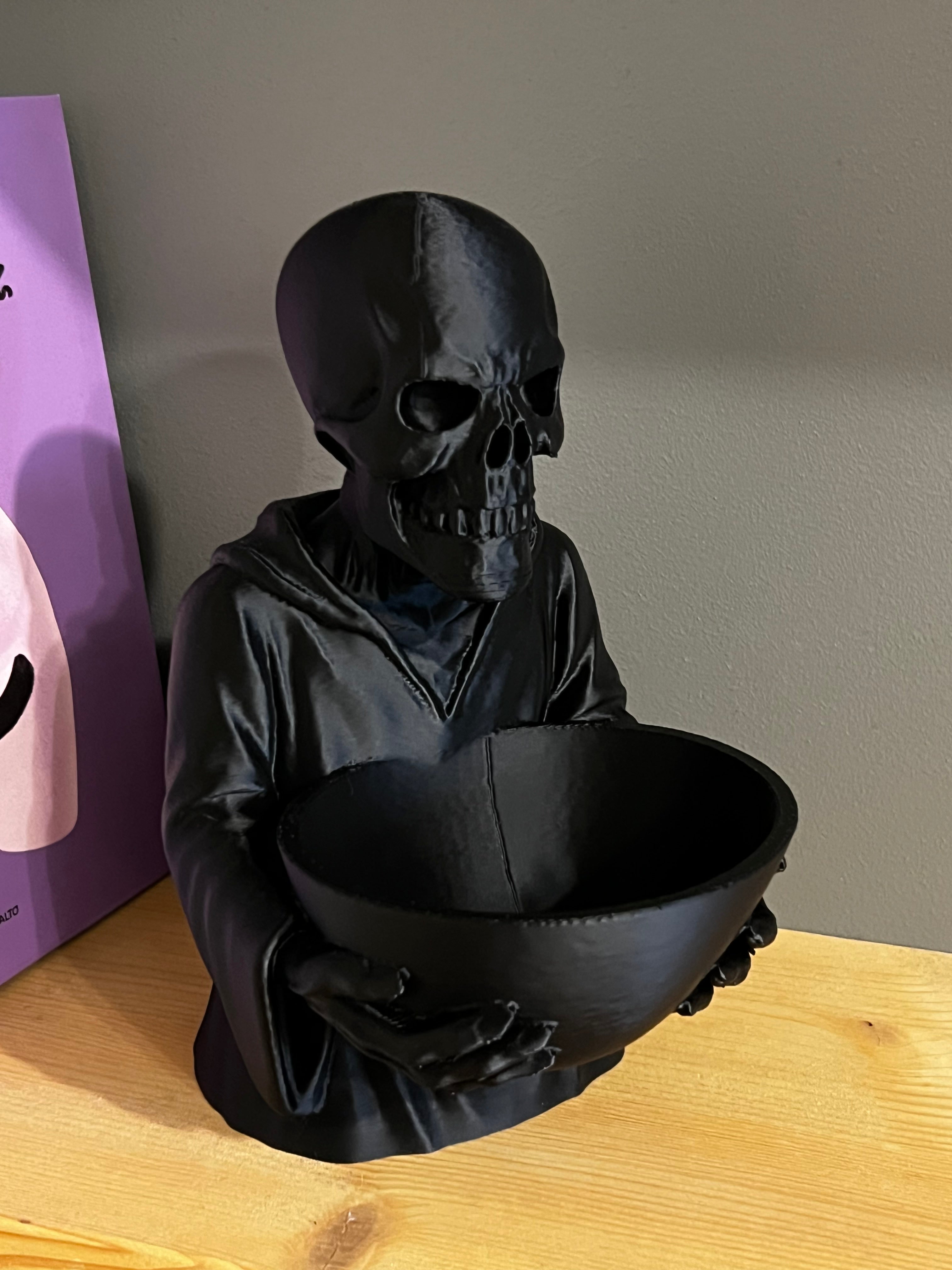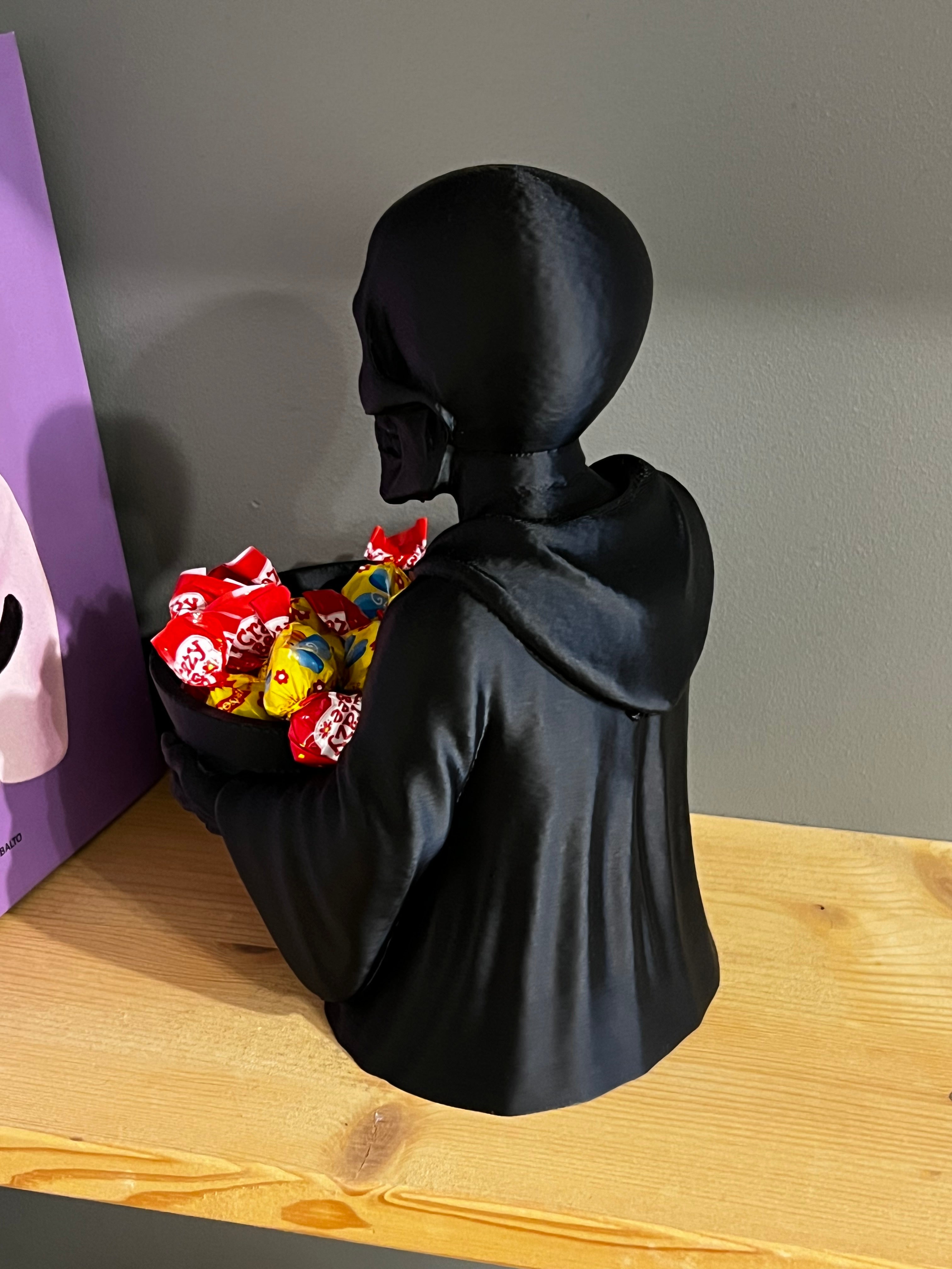Išraiškinga ir funkcionali Helovyno dekoracija – skeletas, tvirtai laikantis talpų dubenį saldainiams ar užkandžiams. Minimalistiškai juoda spalva ir kruopščios detalės akimirksniu sukuria „spooky“ nuotaiką bet kurioje erdvėje – nuo namų prieškambario iki vakarėlių stalo ar parduotuvės vitrinos.