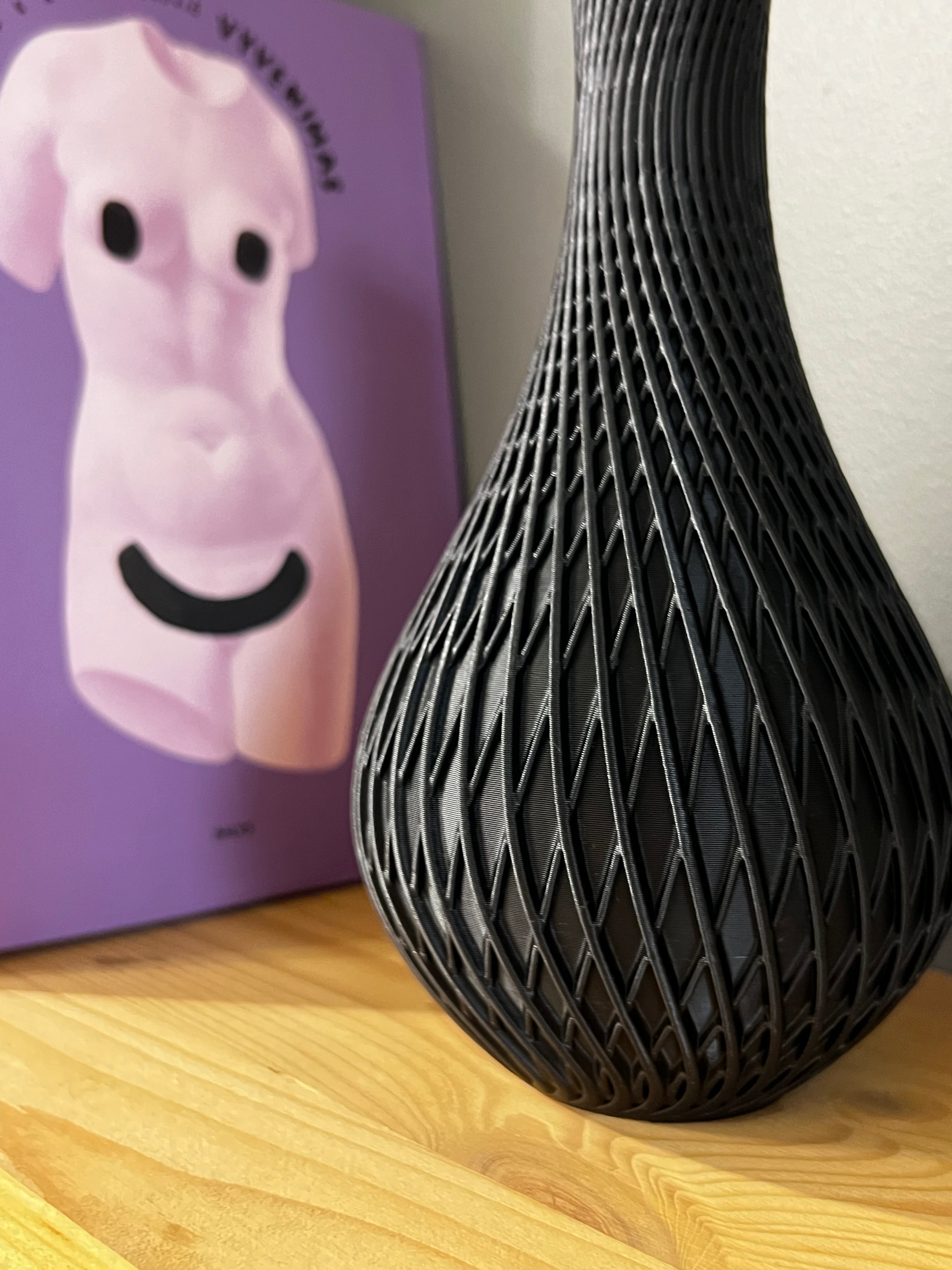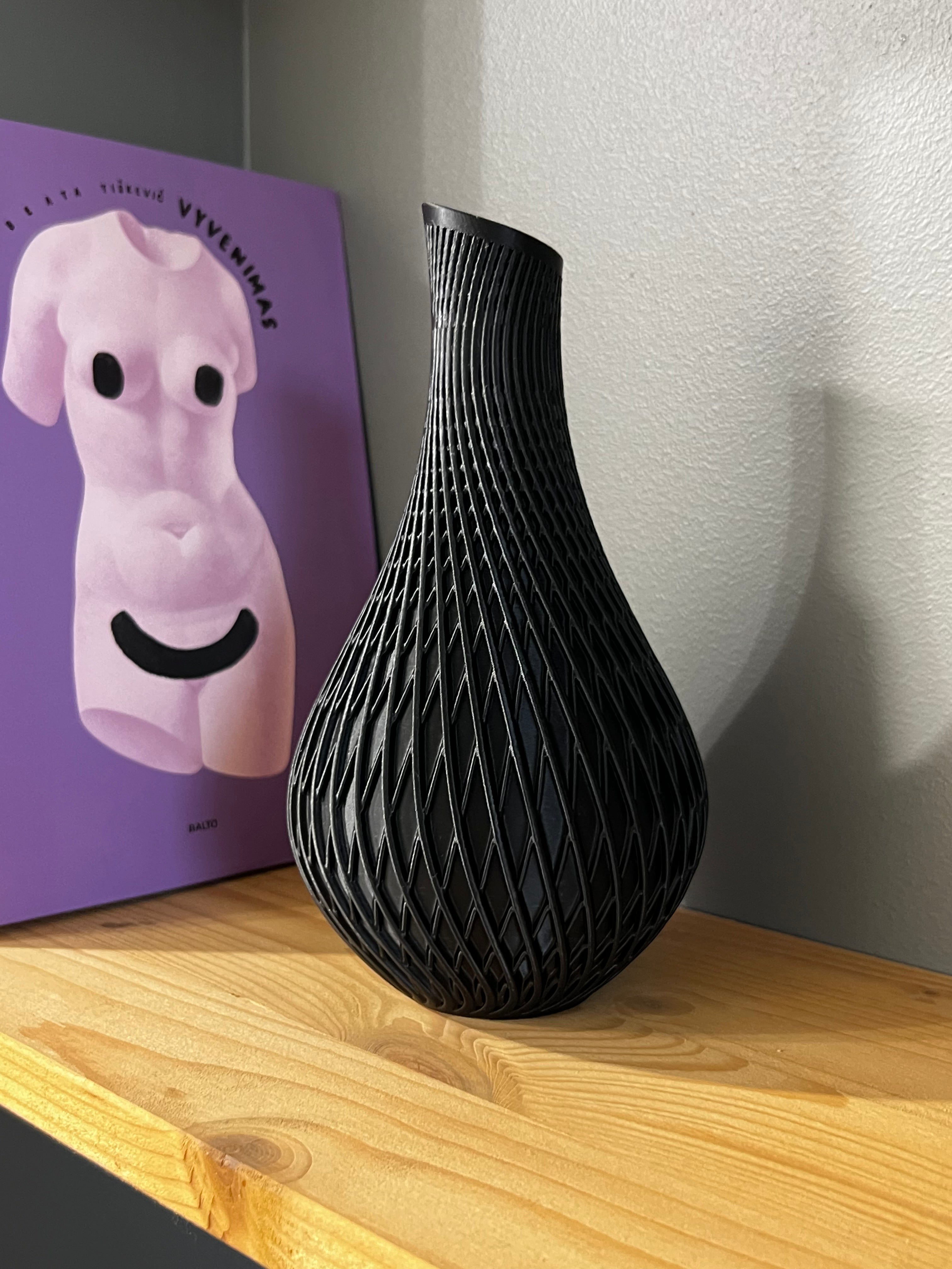 Papuoškite savo namus šiuolaikišku ir elegantišku akcentu su šia unikalia juoda vaza. Jos išskirtinis, tinklelio rašto dizainas sukuria modernų ir dinamišką įspūdį, kuris praturtins bet kurią erdvę. Vaza turi apie 19 cm aukštį ir sveria tik 180 g, todėl ji yra puikus pasirinkimas tiek kaip dekoratyvinis akcentas, tiek kaip gėlių kompozicijų pagrindas.