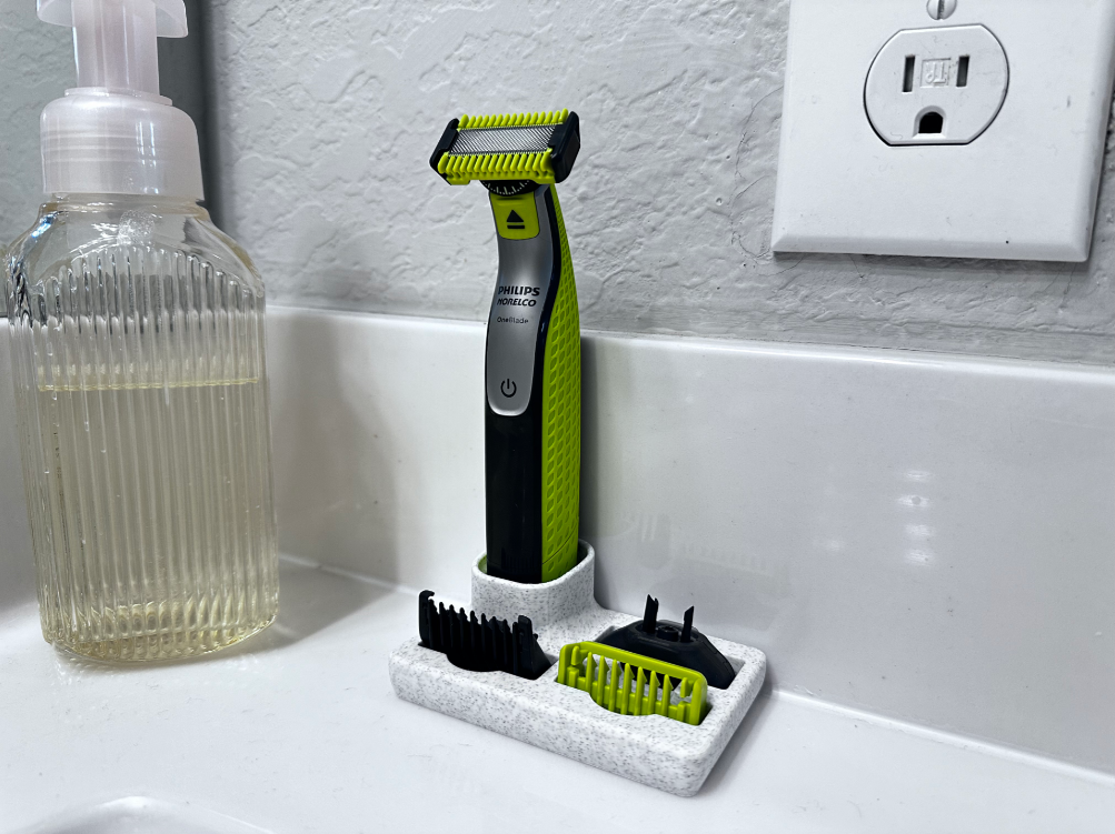 Tvarkingai laikykite savo skutimosi reikmenis su šiuo elegantišku ir funkcionaliu stovu, sukurtu specialiai Philips OneBlade skustuvui.