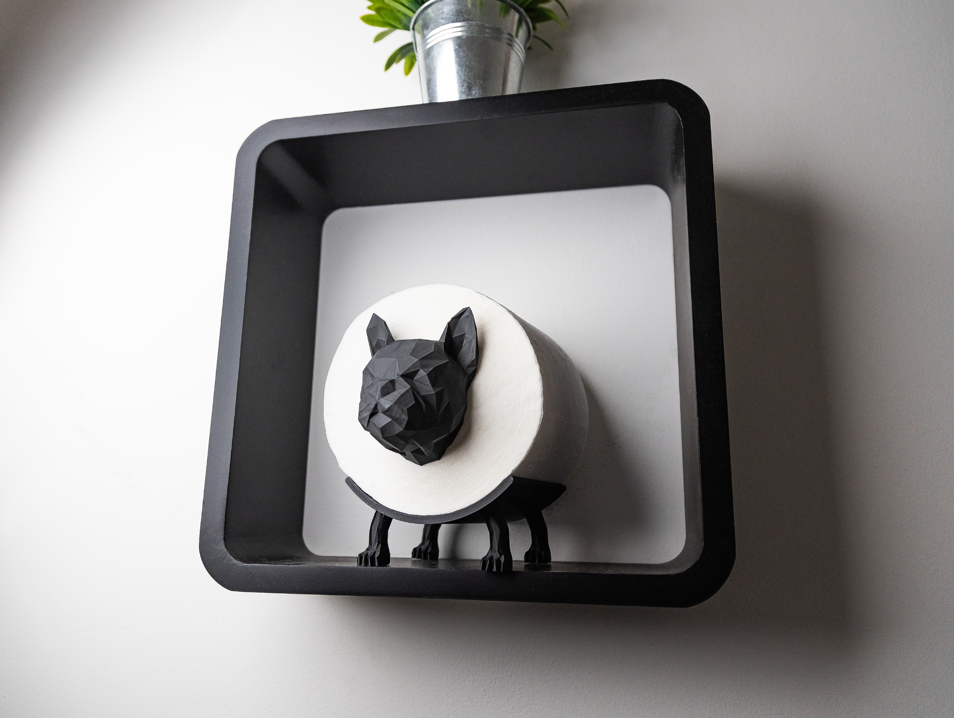 Papuoškite savo vonios kambarį stilingu ir žaismingu prancūzų buldogo formos tualetinio popieriaus laikikliu! Šis unikalus žemų poligonų (low-poly) dizaino akcentas suteiks modernumo ir kartu užtikrins, kad atsarginis popieriaus ritinys visada būtų po ranka.