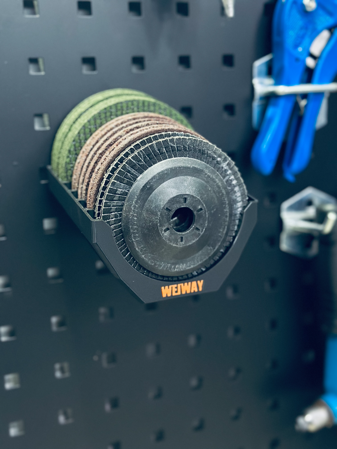 Šis laikiklis sukurtas tam, kad šlifavimo diskai visada būtų saugiai ir tvarkingai laikomi. Konstrukcija leidžia rinktis montavimą ant sienos arba naudoti kaip laisvai pastatomą variantą.